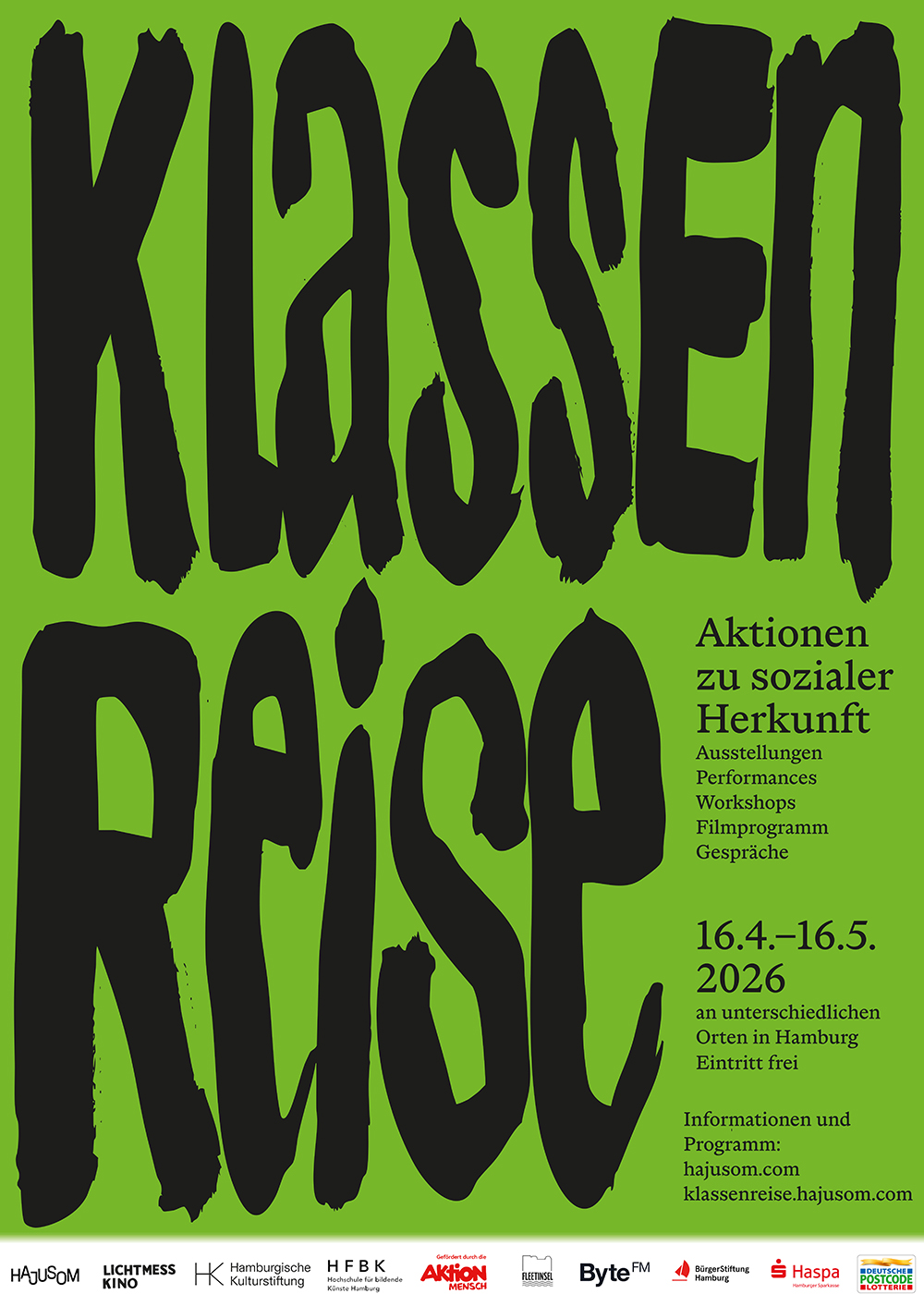 Die Klassenreise – Aktionen zu sozialer Herkunft versucht mithilfe von unterschiedlichen aktivistischen, wissenschaftlichen und künstlerischen Veranstaltungsformaten das Feld struktureller, klassistischer Ungleichheiten aufzufächern. Das Programm findet über vier Wochen von Mitte April bis Mitte Mai an verschiedenen Kulturorten in Hamburg statt und umrahmt u.a. den Tag der Arbeit am 1. Mai sowie den Protesttag für Inklusion der Aktion Mensch. Von Ausstellungen, Performances, einem Filmprogramm, Workshops und Vorträgen ergeben sich partizipative sowie informative Momente des Austausches und Miteinanders. Im Versuch eine Reise zu begehen, entlang unsichtbarer Grenzen, materieller Verhältnisse und auf den Spuren unterschiedlicher künstlerischer sowie politischer Strategien.