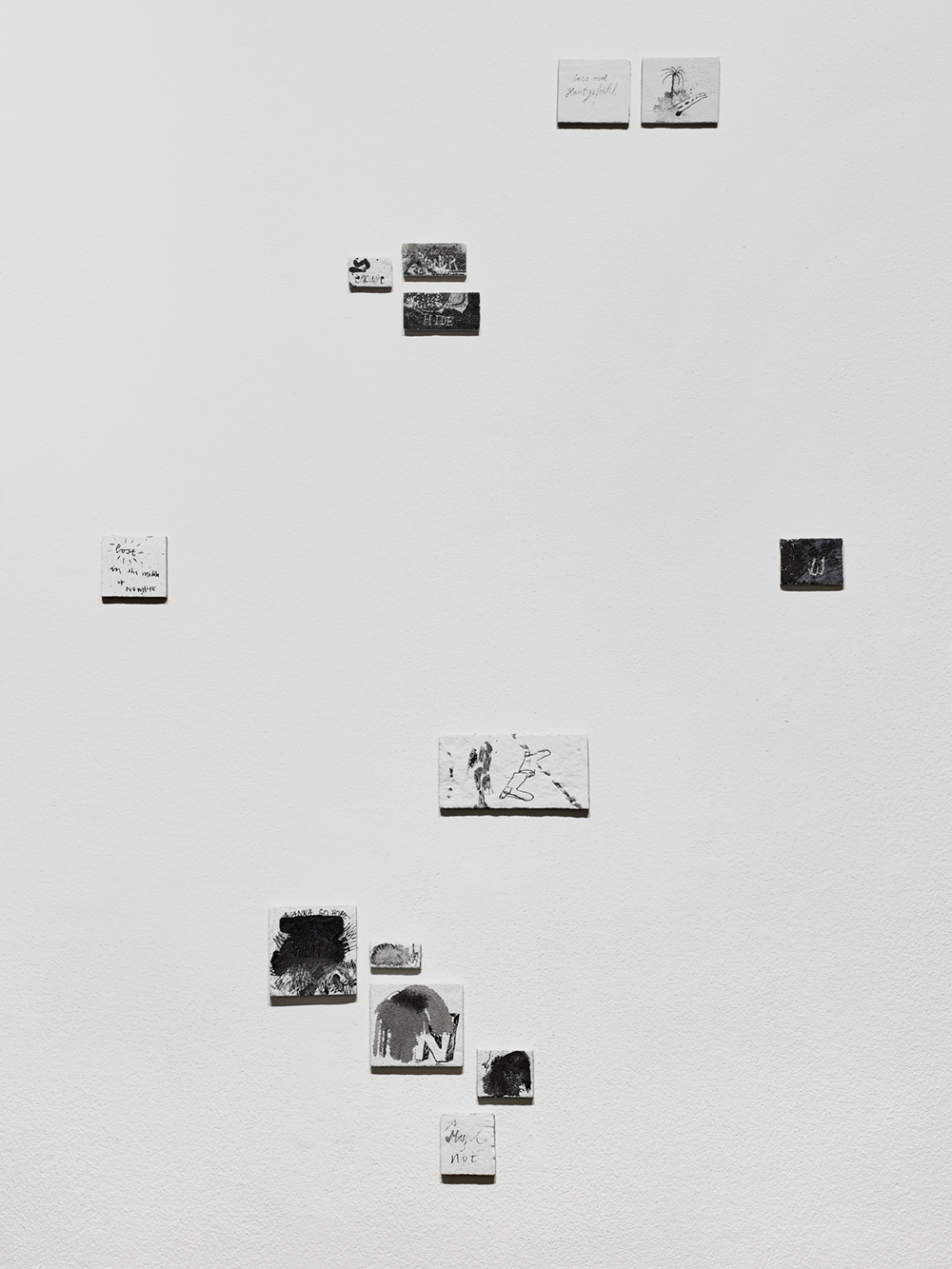 Tusche auf Climaflex (alukaschiertes Polystyrol), Wandfarbe, Graukarton, Zeichnungen mit Tätowiermaschine und Tusche