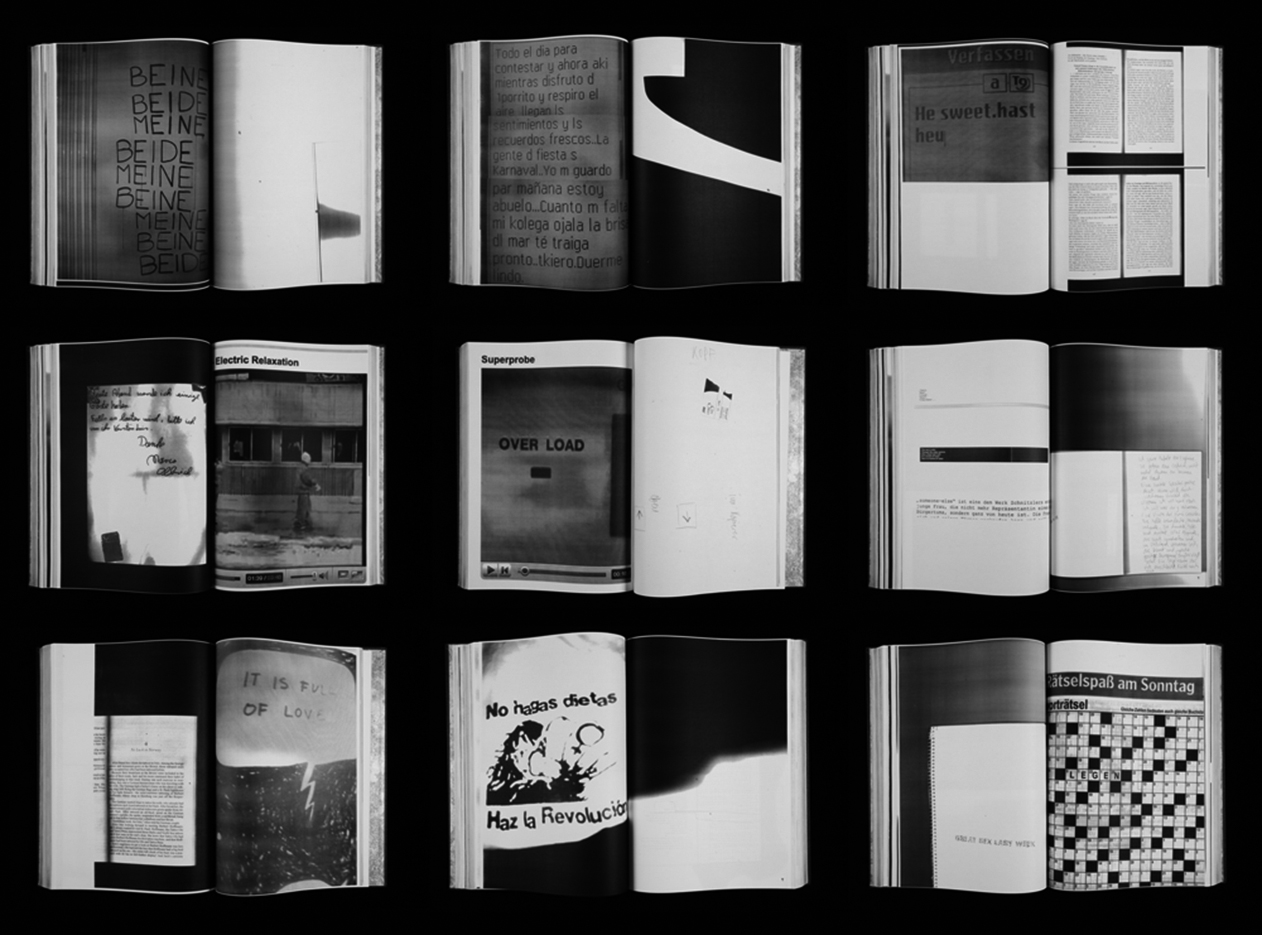 Fotos jeder Doppelseite werden zu einem Loop zusammengeschnitten, der ein unrhythmisches Blättern durch das Buch simuliert.